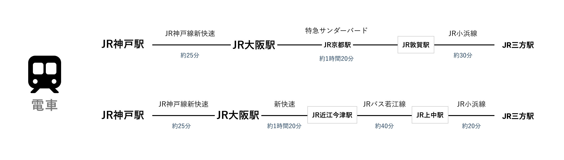 - JR敦賀駅・JR小浜駅の近隣に大手レンタカー営業所があります
