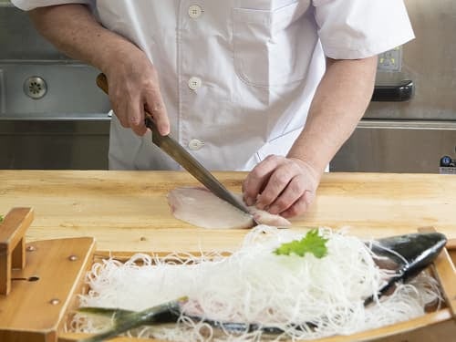 定置網漁で館主自らが獲ってきた新鮮な魚を、館主自ら船盛にしていきます。